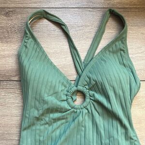 Stylish one-piece swimsuit by Kona Sol. Features a unique ring detail and ribbed texture. Perfect for beach days. Just not my style! It fits nice :)