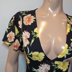 3/$20 Revamped Floral Bodysuit Plunge Vneck Short Flutter Sleeve Black Top Thong