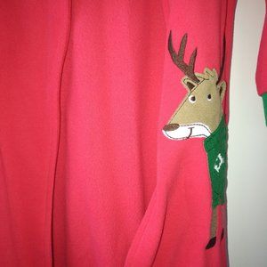 This is a fleece footie pajama by Carter's size 3T. It's red and has a reindeer wearing a sweater applique on it. It's in excellent condition. It was washed but never worn. It was bought in the boy's section but it could also be for a girl.