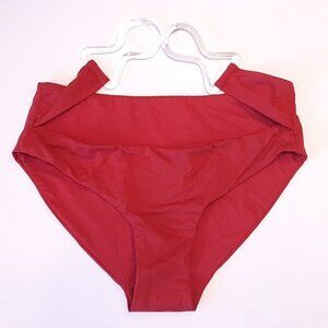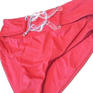 Split front design with clear turn-clasp in a soft, romantic red. High waisted. Measures 12" across the waist, 10.25" long down the back center. Designer brand from Costa Rica.