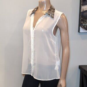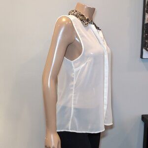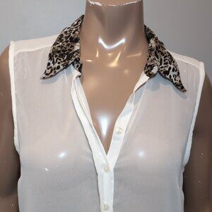 3/$20 Vero Moda Sheer Sleeveless Blouse Buttoned White Leopard Collar Size Large