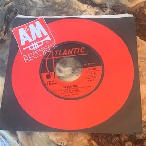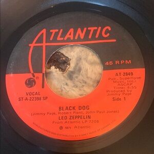 Vintage Led Zeppelin 'Black Dog' vinyl record. Classic black disc with red label.