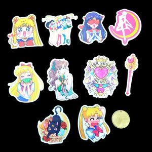 10 pcs brand new waterproof Sailor Moon stickers. You get exactly what you see on the photo. ( $2 coin is NOT included, just to show you the size of the stickers)