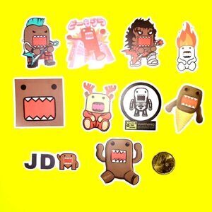 10 pcs brand new Domo Kun waterproof stickers. You get exactly what you see on the photo. ( $2 coin is NOT included, just to show you the size of the stickers)