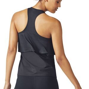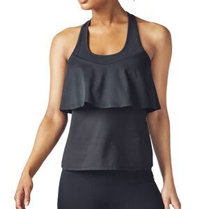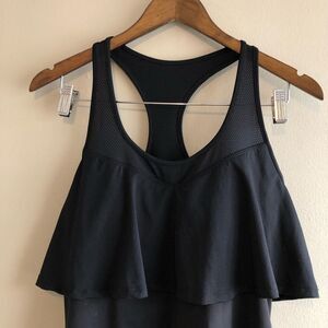 Fabletics Ashlynn flowy layer detail soft and stretchy racerback workout sport tank top cami shirt with built in bra with removable padding included. Black in color. Size M / medium. Signature high-performance fabric features all-way stretch and moisture-wicking technology. A lightweight knit with a brushed, cotton-like feel.