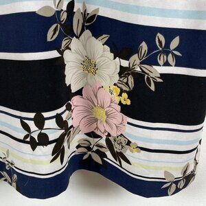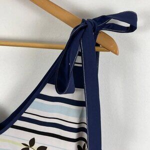 Classy floral print on navy stripe background with shoulder toe accents and deep V neckline.