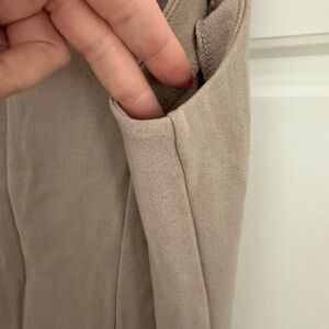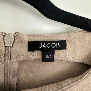 This sophisticated tan sheath dress by Jacob features a chic halter neckline and a sleeveless design, perfect for work or cocktail events. Its form-fitting silhouette and midi length offer a polished and elegant look, making it a versatile addition to any wardrobe.