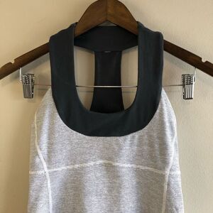 Lululemon stretchy sport workout racerback sleeveless scoop neck tank cami shirt top with built in bra (pad inserts not included). Grey and white in colour. Size 4. Approximate measurements | armpit to armpit: 13.5“ length: 22-24“ bra bottom band: 12“ across Great gently pre loved condition. No fabric and care tag attached: Luon. Offers welcome!