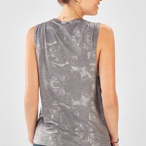 This is a new but tags off tank top. Beautiful . Silver metalic design. Large arm holes to flatter under sports bra. Flattering and stylish. Looser fit. Excellent condition