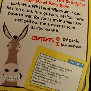 Each "Who", "What" and "Where am I?" card has ten clues. And guess what? You never have to wait for your turn in Smart Ass. Just yell out the answer as soon as you know it! Timing is everything for the true Smart Ass. Jump in too early and you may blow your chance! Wait too long and the Smart Ass next to you might steal the show. When will you throw your shoe in the ring?