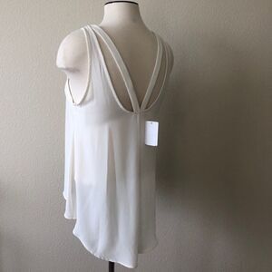 LUSH cut out tank top in white. Hi low hemline with vee back. Super elegant! Semi sheer. Photos on mannequin are not my own but show how the top fits on!