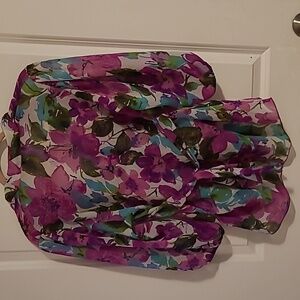Great condition floral top with 3/4 sleeves. slightly sheer. Ruffled collar, elastic sleeves, and belted at the middle with a back tie.