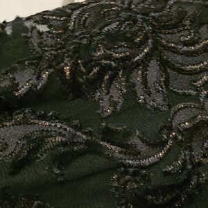 A halter style black dress with deep vee neck and backless. Has a soft raised jacquard pattern with gold sparkle. I tried to show the fabric and pattern. Ties around the back and at the neck. BNWT.