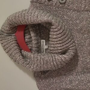 A beautiful light grey and pink knit sweater with cowl neck and button detailing at one shoulder. The hem down the centre is attached. Excellent condition.