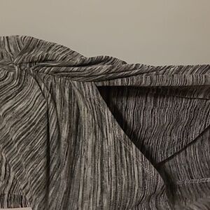 A heathered black and grey knit skirt. Ruching and a slit on one side, with elastic waist. Good used condition. Waist flat is 14.5" with some stretch and 23" long at longest part.