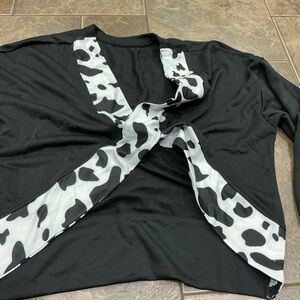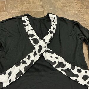 NWT Open back shirt, Front of shirt is black, criss cross white pattern on back. Stylish black and white women's top featuring a unique cross pattern on the back. Perfect for casual outings or a chic look. Criss cross crew neck, loose pullover