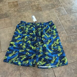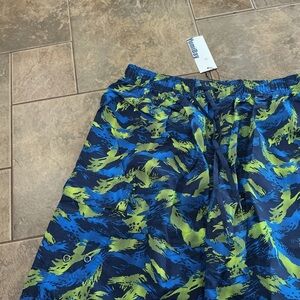 NWT Dive into style with these vibrant swim board shorts, featuring a striking blue and green pattern. Perfect for your next beach getaway. Has a side pocket and drawstring waist. These shorts also have a mesh liner underneath.