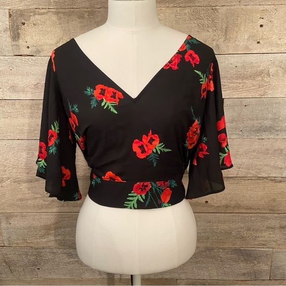 Excellent condition Black with red flowers Flutter sleeves Tie up open back Size small