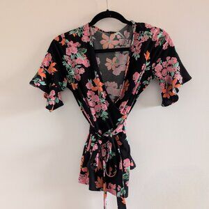 Floral print wrap today with flutter sleeves. In perfect condition, no rips or stains.