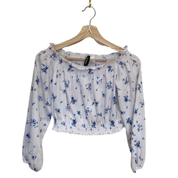 3/$30 ✿ H&M White Blue Floral Off The Shoulder Cropped Peasant Blouse Size S