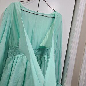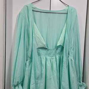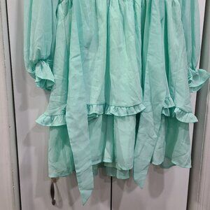 NWOT light green, mint color dress with straps to criss cross to tie up for chest. Ruffle sleeves and ruffle bottom, long sleeve dress.