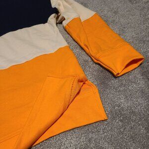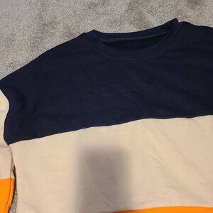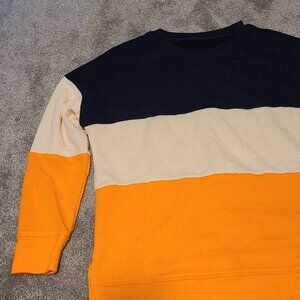 NWOT sweater, tri color striped, stripes go all the way around the shirt, side split at waist. Cuffed sleeves.