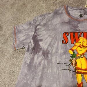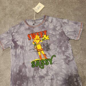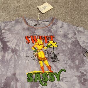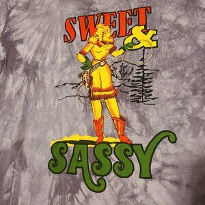 "Sweet and Sassy" on the front. Purpley grey tye dye shirt.