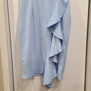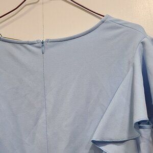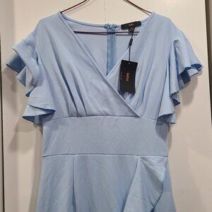 NWT Knitee Light blue Dress with ruffle sleeves and ruffle in the front. Has a zipper on the back. Slightly stretchy material. Zipper goes all the way down the back- 20" Length zipper.