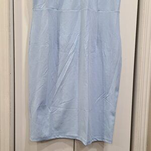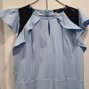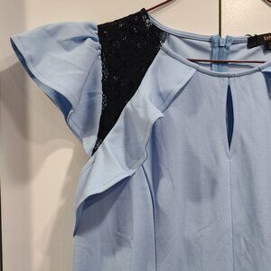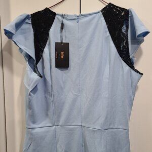 NWT Light blue knitee dress with black lace on the shoulders. Sleeveless but has blue material to cover the top of shoulder. Has a small opening in the front at the top of the dress. Has a full zipper on the back.