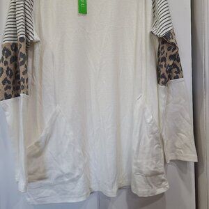 NWT White long sleeve shirt with patterns on the sleeves- stripes and Leopard print. Has 2 front pockets. No design on back of the shirt.