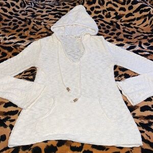 This sweater is in great used condition! It’s from the brand Roxy! I would say it’s a woman size medium based on the measurements! It’s kinda like a towel material definitely beach vibes.