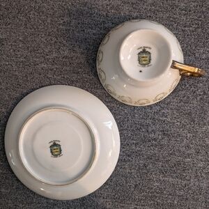 The cup measures 4" in diameter, 2" tall; saucer measures around 5 1/2" diameter.