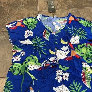 NWT Vibrant blue dress with tropical floral and leaf patterns. Perfect for a summer outing. Has drawstring waist.
