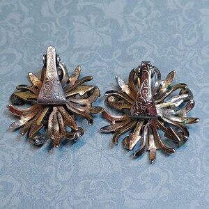 Vintage 1930-40s Signed Sterling PAT 1967965 Clip Earrings with Rhinestones in Goldtone. These stunning earrings are perfect for any special occasion, including Mother's Day, Christmas, anniversaries, birthdays, and Valentine's Day. The snowflake shape and round white/colourless rhinestone main stones are set in a prong setting style made of sterling silver. The clip style provides a comfortable and secure fit for all-day wear. These earrings are a beautiful addition to any fine jewellery collection.