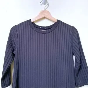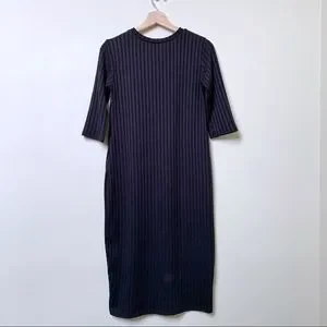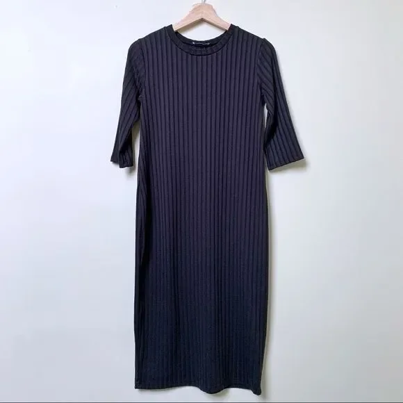 Column dress in a black, ribbed fabric. Crew neckline, elbow length sleeves, midi length. Composition tag removed, but is 100% polyester.