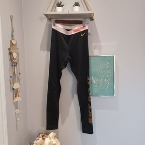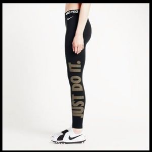 Nike Pro Thick Band Leggings size S. Excellent presentation. Gold logo, Pink waistband and Gold "Just Do It" Graphic leg. 80% polyester, 20% spandex.
