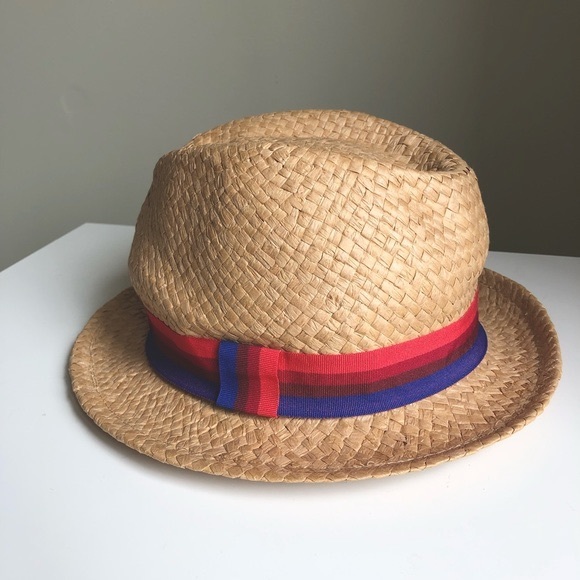 Smart Set tan beige fedora straw hat. Blue, red and pink ribbon. Tan lining. Lightweight. Woven paper material. Pairs well with bags. Summer vacation sun outdoor beach cottage.