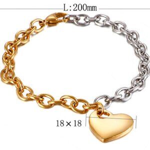 Add a sweet touch to your style with this two-tone heart charm bracelet, featuring a mix of gold and silver chain links with a polished heart pendant. This minimalist yet trendy piece is perfect for layering or wearing solo. Lightweight and comfortable, it makes a stylish everyday accessory or a thoughtful gift for her. Ideal for birthdays, anniversaries, or just because!