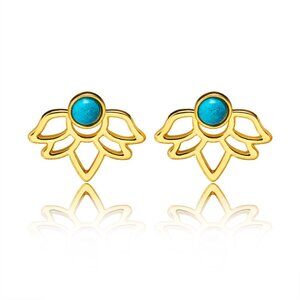 Elegant lotus-shaped earrings featuring a vibrant turquoise stone at the center. The gold outline accentuates the delicate petal design, adding a touch of sophistication. Perfect for adding a pop of colour and style to any outfit. Ideal for daily wear or special occasions.