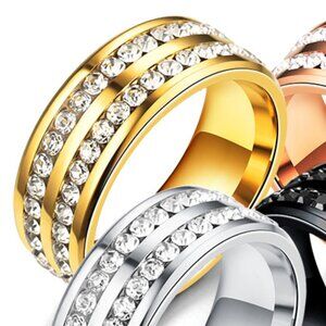 3/$35 Double Row Gold Tone Stainless Steel Band Ring Diamond Zirconia Gemstones