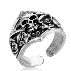A bold and edgy style striking skull ring. Featuring an intricate design of skull and vine patterns, this ring exudes a rebellious and daring aesthetic. The open-ended design ensures a comfortable fit, making it a versatile accessory for any occasion. Perfect for those looking to add a touch of gothic allure to their ensemble.