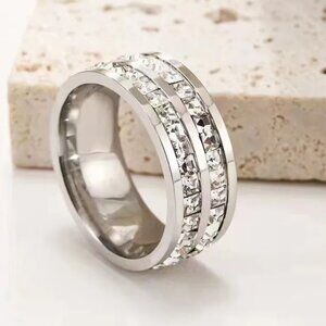 TAGS: silver band ring, double row rhinestone ring, wide silver ring, women’s wedding band, stainless steel jewelry, promise ring silver, eternity band ring, anniversary band