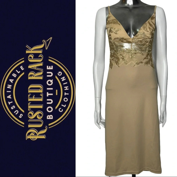 🛍️ 3/$40 Gold Lace Overlay Plunging V-Neck Slip Dress Size Small