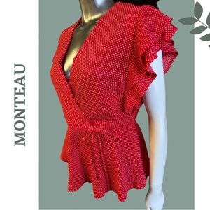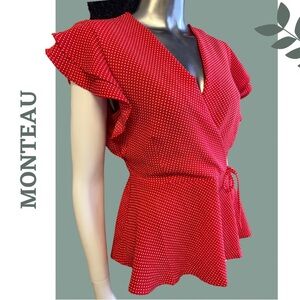 🛍️3/$40 Monteau Blouse Red Polka Dot Flounce Sleeve Faux Wrap Medium