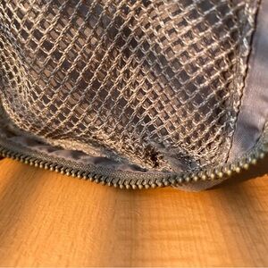 Saje pouch’s zipper works perfectly but there is a stain (attempted to remove but only tried dish detergent) on the inside, and tear on the meshing.