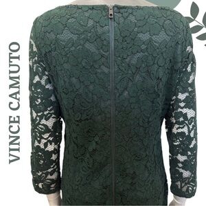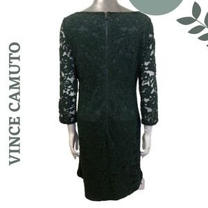 Turn heads at any occasion with this Vince Camuto dark green lace sheath dress. Featuring delicate floral lace, sheer 3/4 sleeves, and a flattering silhouette, it’s perfect for holiday parties, evening events, or semi-formal gatherings. The back zipper adds function while maintaining the sophisticated style.