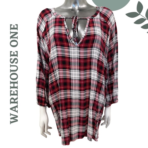 Add a little rustic charm to your wardrobe with this ultra-cozy, 100% rayon blouse from Warehouse One! Featuring a classic red plaid pattern, this flowy tunic-style top is perfect for layering, lounging, or casual adventures. The keyhole neckline with tie-front detail adds just the right touch of playful femininity.