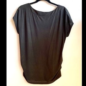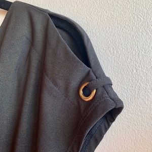 Loose fitting black bourse with cute shoulder peeps with gold grommet detail and ruched lower sides. Size M with a bit stretchy material,