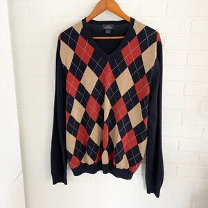 346 Brooks Brothers Men’s Knit Sweater Merino wool Argyle Navy blue Tan Orange L