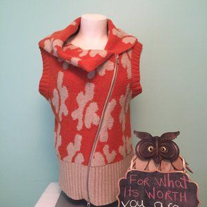 This quality lambswool/wool/mohair cowl neck vest by Moda International is in excellent condition. Creamsicle orange and cream colour pallette .Wide waist ribbed banding and a two way diagonal zipper. This unique and beautiful vest is versatile and comfortable.